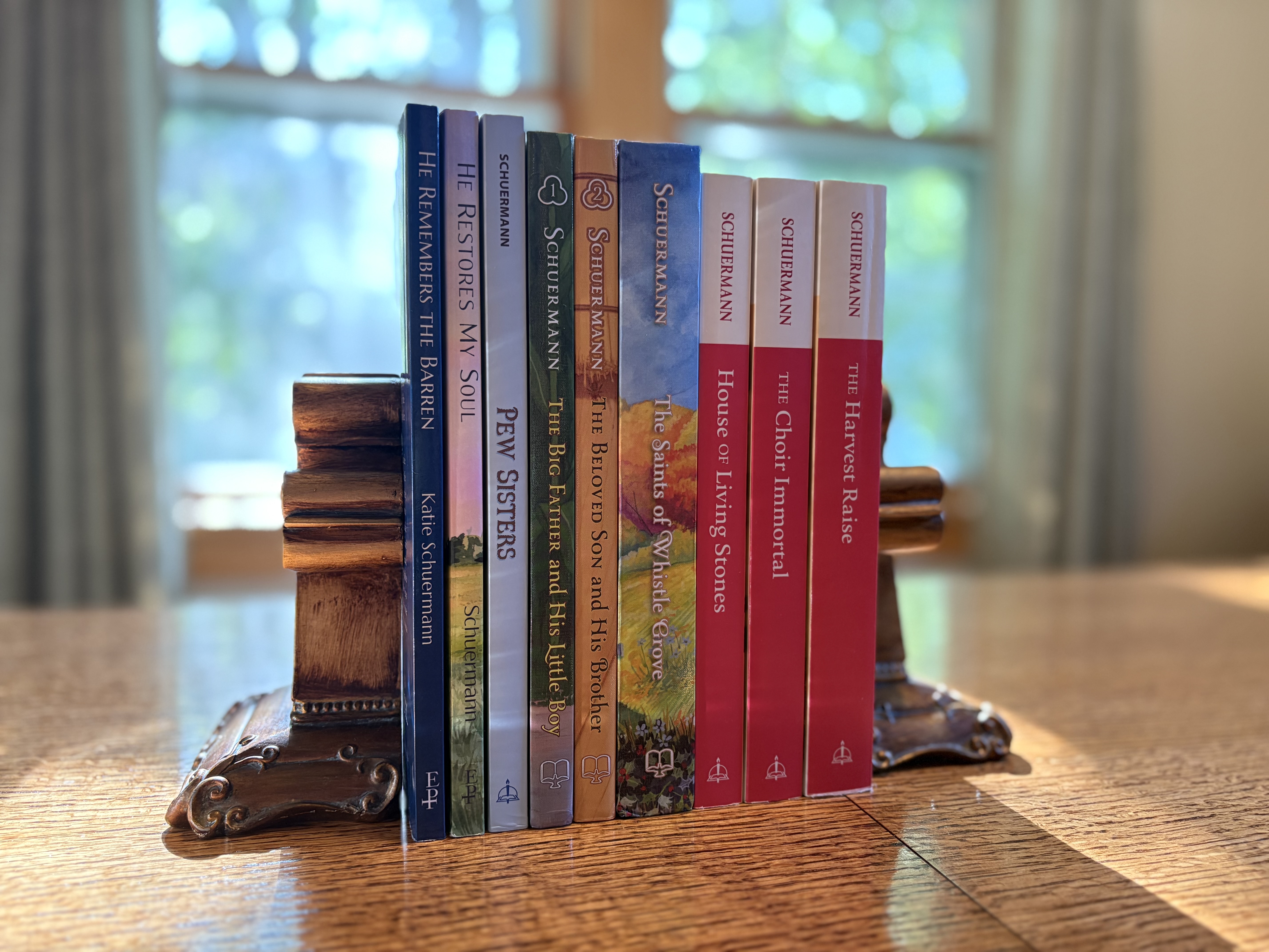 Schuermann’s latest standalone novel, The Saints of Whistle Grove (KP, 2023), tells the story of the life and death of a church told through the lives and deaths of the people buried in its cemetery. Her beloved, acclaimed Anthems of Zion fiction series, including House of Living Stones (CPH, 2014), The Choir Immortal (CPH, 2015), and The Harvest Raise (CPH, 2017), tells the story of Emily Duke, a choir director from the big city who moves to a small town in Illinois to direct the local church choir. Her nonfiction books, He Remembers the Barren (LL 2011; 2nd ed., EP 2017), Pew Sisters (CPH, 2013), and He Restores My Soul (EP, 2018), address the topic of suffering and the theology of the cross for the benefit of her sisters in Christ.